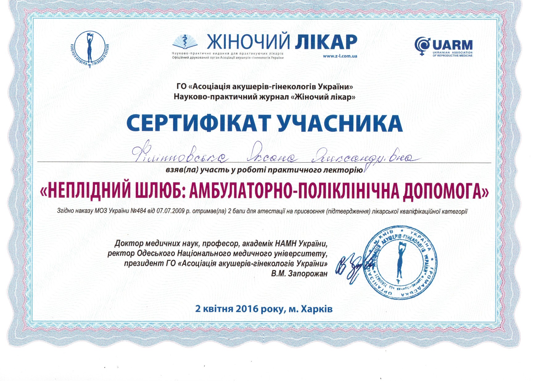 - «Бесплодный брак: амбулаторно-поликлиническая помощь», практический лекторий Ассоциации акушеров гинекологов Украины, 2016 г., Харьков