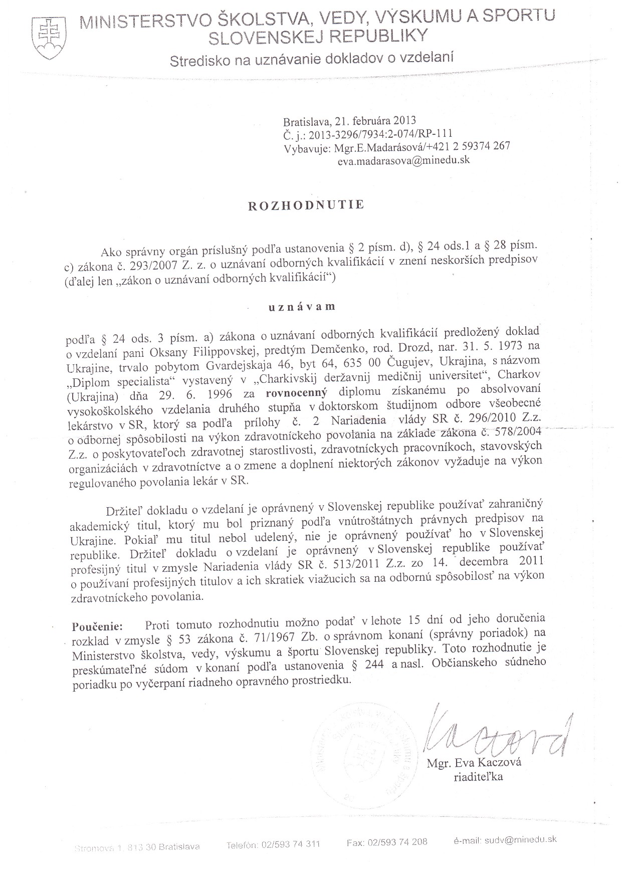 - Врач высшей категории по специальности «Акушерство и гинекология», врач I категории по специальности «Ультразвуковая диагностика»